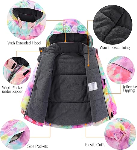 Zipper & Velcro Closure Skiing Jackets for Kids: The warm padded ski jackets features thick hoodie chin guard. The zipper and velcro in front and elastic cuff will prevent your kids from getting cold. And also these cute snowsuits are designed with reflective stripes so that you can spot your kids in dim light.