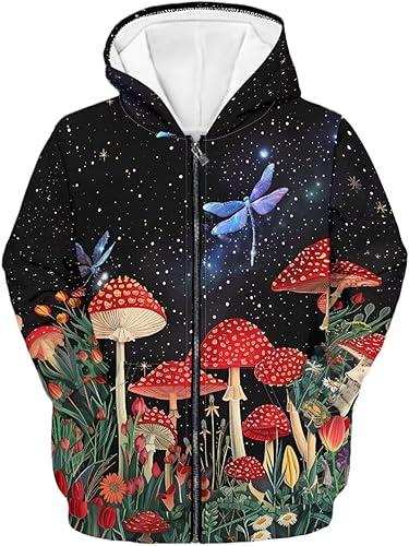 Girls Boys' Zip Up Hoodies Sweatshirts Hoody Jacket Zipper Pullover with Long Sleeves(Mushroom Dragonfly Galaxy,Large)
