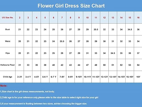 Size: Please refer to the size chart before ordering and chose the right size for your child.If you need a customized size of the chiffon flower girl dress,please provide us with the size including bust,waist,hip,hollow to floor
