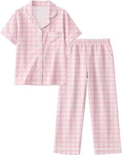 Girls Button Down Pajamas Sleepwear 2pcs Short Sleeve with Long Pants Set, 5-14 Years(Pink Grid,5-6 Years,Little Girl)