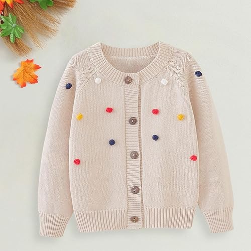 Girls Cardigan Sweater Colorful Hairball Cable Knit Long Sleeve Plain School Uniforms Kids Cozy Cute Fall Clothes(Beige,12-18 Months)