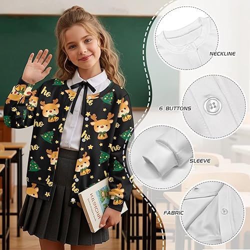 Girls Cardigans Sweater Long Sleeve Crew Neck Button Down Sweaters School Outerwear for Kids Fall Winter Tops(Christmas Deer,7-8 Years)