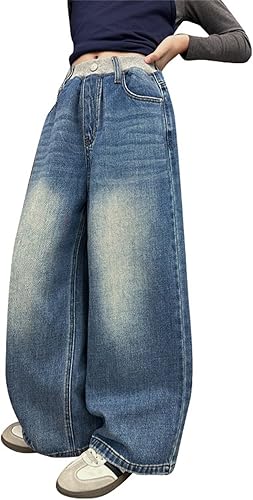 Material Comfortable Fit:Crafted from denim, these jeans for girls ensure comfort and durability. The wide-leg, baggy design offers ample room for movement, making them for active kids. High-waisted with an elastic waistband