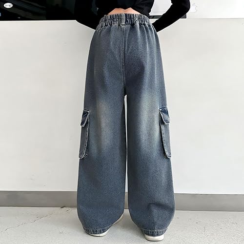Girls Cargo Jeans Baggy Y2K Denim Pants Wide Leg Elastic Waisted Trousers with Multi Pockets Casual Streetwear Jeans(Blue,5-6 Years)