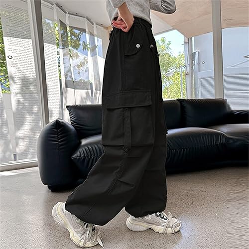 Girls Cargo Pants for Teens Straight Wide Leg Palazzo Elastic High Waisted Solid Color Trousers with(Black,10-11 Years)