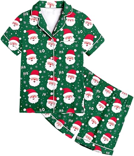 Girls Christmas Shorts Set Silk Satin 2 Piece Funny Xmas Santa Holiday Outfits Button Up Short Sleeve Shirts & Shorts(A01-green,10 -11 Years)