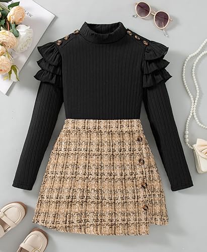 Elegant and Trendy Skirt Sets : Designed with ruffle sleeve, button decoration on shoulders, Long sleeve and ribbed sweater shirts, adding energy and cute when girls wear this girls clothes. Plaid mini skirts with elastic waistband. This girls skirt sets will offers stylish and classic look.