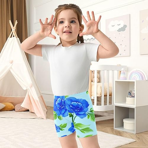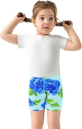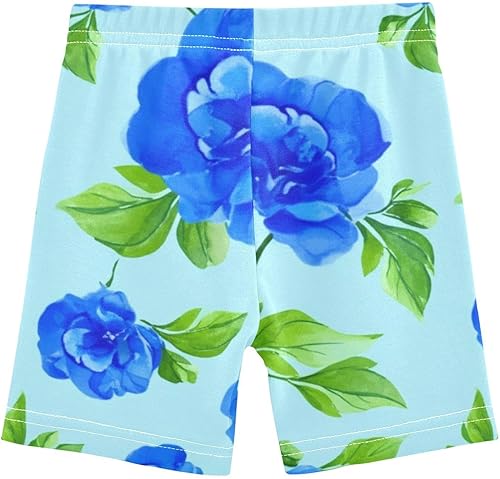 Soft and breathable bike shorts for girls with blue flowers and green leaves print, made of 95% cotton and 5% spandex.