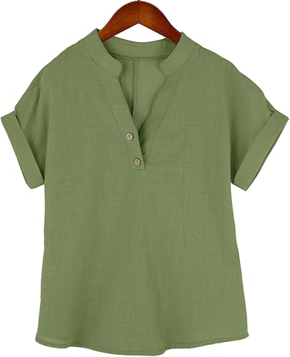 Girls Cotton Linen Shirts Short Sleeve V Neck Tunic Casual Linen Blouse Cute Summer Tops for Girls School Uniform Shirts(Green,5-6 Years)
