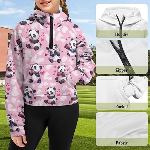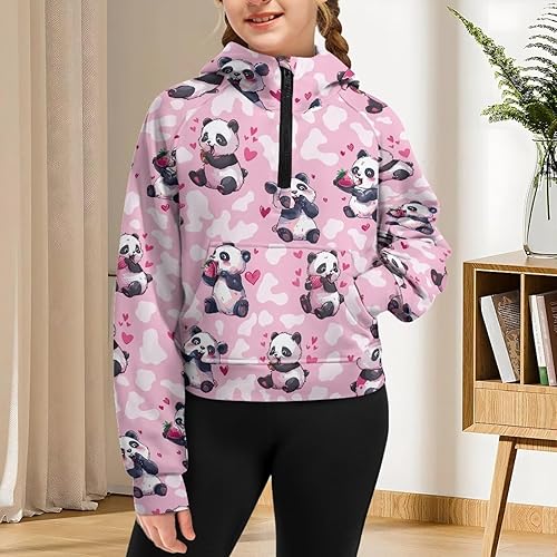 Cute Girls Zipper Hoodie: Half zip up neckline with adjustable collar height, cozy plunge sleeves with kangaroo pockets for protection from the elements, loose fit, short pullover top with elasticized ribbed cuffs and elasticized hem, easy to put on and take off, windproof and warm, creating a casual and stylish look
