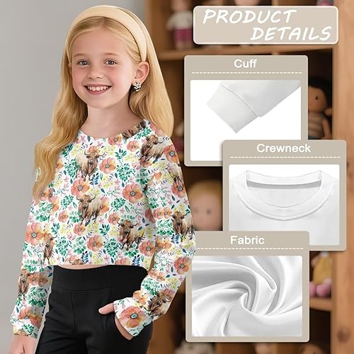 Girls' Cropped Pullover Preteen Girls Long Sleeve Crewneck Sweater Trendy Aesthetic 5-14 Years Teen Girl(Highland Cow Floral,9-10 Years)