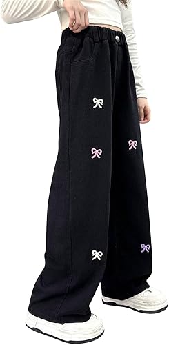 Girls Cute Baggy Jeans with Bow Embroidery Straight Wide Leg Denim Pants High Elastic Waist Solid Color Fall Trousers(Black,7-8 Years)
