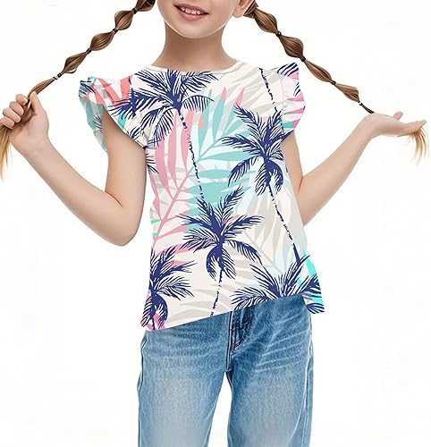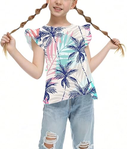 Girls Cute Printed Ruffle Sleeve T-Shirt Colorful Fun Design Soft Summer Casual Outfit(2-beige,4-5T)
