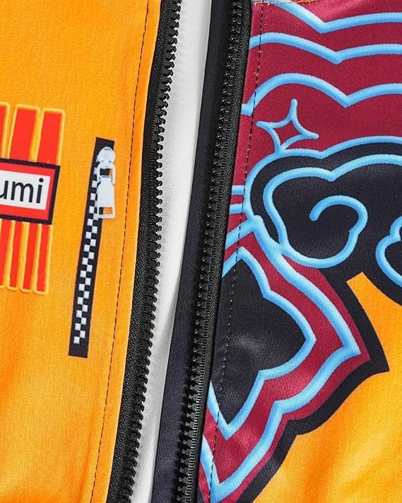 Features: High Neck Tank Top, Zip Up Orange Jacket Coat with Print , Color Block Shorts , True to Detail Design, Showcasing the charismatic, confident and friendly Rumi