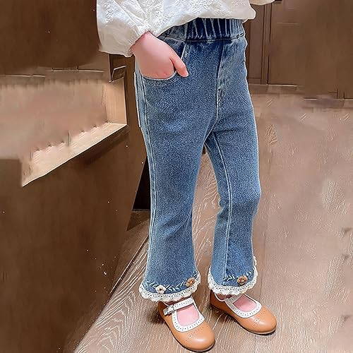 Girls Denim Bell Bottoms Jeans Ruffled Lace Flower Design Denim Pants Kids Wide Leg High Elastic Waist Jeans(Blue,5-6 Years)