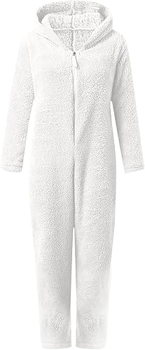 Girls Fleece Jumpsuits Fuzzy Bear Hooded Kids Zip Up One Piece Fluffy Rompers Cute Winter Warm Preppy Clothes 2-14Years(White,12-13 Years)