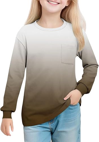 Girls Gradient Color Long Sleeve Shirts Casual Crewneck Loose Fit Pullover Fall Fashion Sports Shirt Cute Tops(Brown,13-14 Years)
