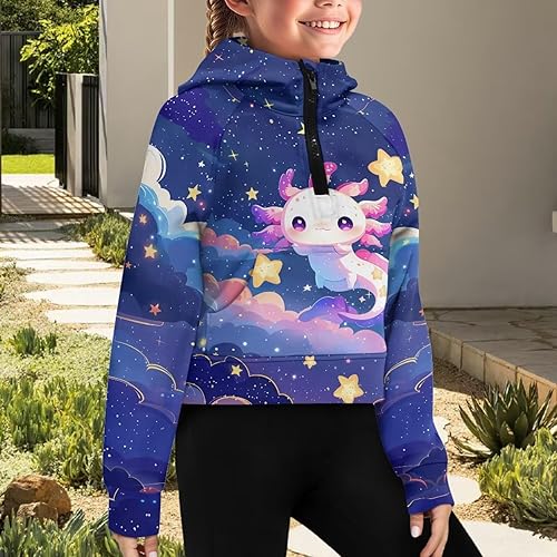 Cute Girls Zipper Hoodie: Half zip up neckline with adjustable collar height, cozy plunge sleeves with kangaroo pockets for protection from the elements, loose fit, short pullover top with elasticized ribbed cuffs and elasticized hem, easy to put on and take off, windproof and warm, creating a casual and stylish look