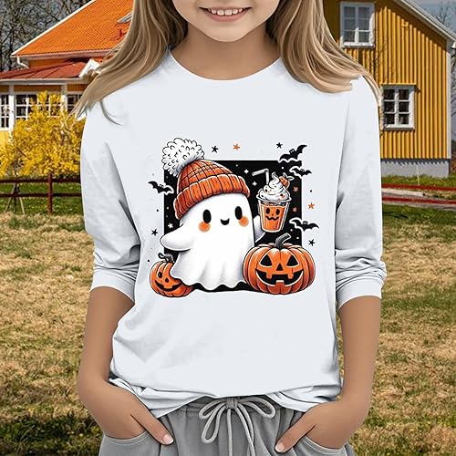 Girls Halloween Long Sleeve Shirts Fall Soft Cute Graphic Crew Neck Tops Teen Kids Thin Comfy Pullover Sweatshirts(White,3-4T)
