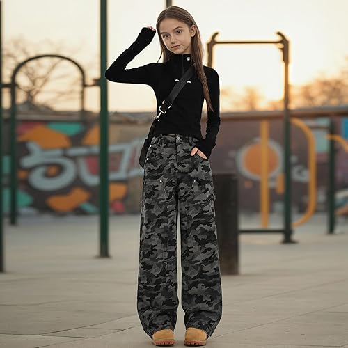MILITARY DESIGN: Tactical cargo pants for girls featuring a rugged camouflage pattern and multiple utility pockets for storage capacity