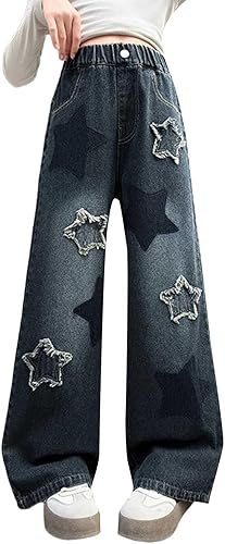 Girls Jeans Cute Star Graphic Tassel Trim Elastic Waist Straight Wide Leg Soft Denim Pants for Kids 5 to 16Y(Blue,5-6 Years)