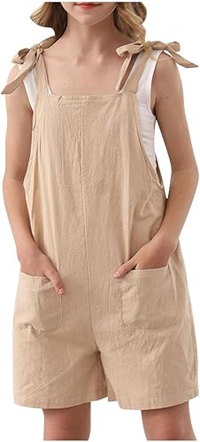 Girls Jumpsuit Sleeveless Adjustable Tie Strap Short Romper with Pocket Summer Casual Playwear for Active Toddlers and Kids(Khaki,11-12 Years)
