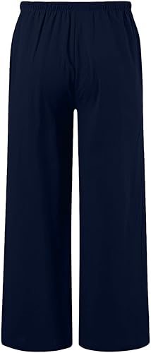 Girls Linen Wide Leg Pants High Waisted Drawstring Palazzo Pants Breathable Summer Casual Trousers Linen-Blend Bottoms(Navy,10-11 Years)