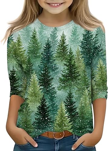 Girls Long Sleeve Christmas Print T Shirt Casual Crewneck Comfortable Soft Top for Fall Winter Holiday Wear(2-green,4-5T)