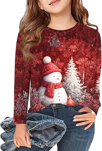 Girls Long Sleeve Crewneck Shirt Christmas Themed Design Winter Casual Loose Fit Pullover Top Size 2-11 Years(3-white,4-5T)