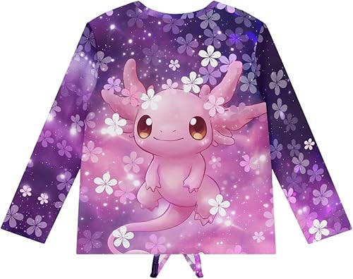 Girls Long Sleeve Shirts Kids Loose Fit Crewneck Tie Front Knot T Shirts Soft Tees Size 5-12(Cherry Blossom Axolotl Print,11-12 Years)