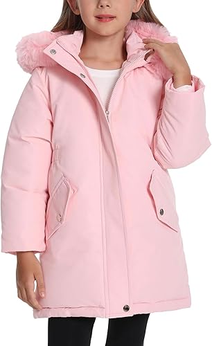 Girls Long Winter Down Coat Thicken Fleece Lined Parka Kids Warm Puffer Jacket With Detachable Hood (Pink, 9-10 Years)