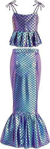 Shiny Mermaid Dress Set:Perfect for little dreamers! Our girls mermaid skirts features shimmering scale patterns and a flowing hem. Girls mermaid tie shoulder shirts with sparkling scales pattern.