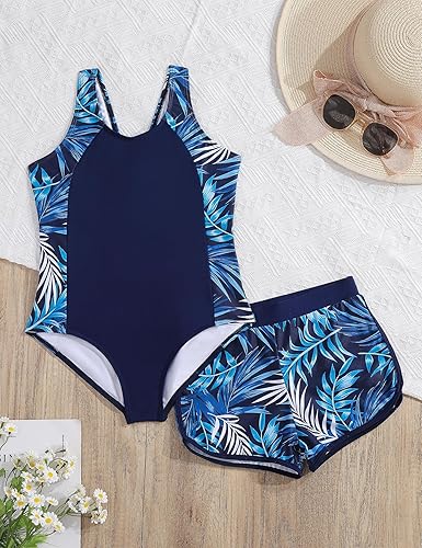 【Swimsuit Features】This girls swimsuits design with scoop neck, contrast bright color tropical print make swimsuits more comfortable and cute! One-piece swimsuits are flattering for all body types and easy to wear and remove.Slim full bottom coverage which elegantly contours your curves and cover up shorts provide extra adequate coverage.