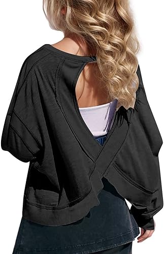 Girls Open Back Workout Crop Tops Long Sleeve Casual Athletic Shirts Kids Yoga Gym Tees Teens Backless Crewneck Sweatshirts(Black,9-10 Years)
