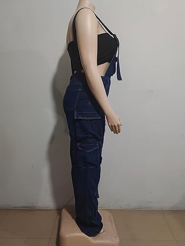 Girls overalls women's denim overalls straight high waist Y2K work jeans street fashion summer shoulder large pocket jumpsuit (Medium, blue)