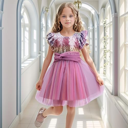 Exquisite Design: Our girls party dresses features a rainbow gradient color scheme, a round neckline with ruffle tulle lantern sleeves, all over sequin detailing, zipper closure on the V-shaped backless,Our fancy dresses for girls girls dresses size 6 below the knee and fully lined design to ensure that your little princess all day long to feel relaxed and at ease.Our girls purple dress girl size 6 clothes with eye-catching design is suitable for pageant ball.