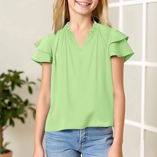 Comment on "Girls Pleated Short Sleeve T Shirts Summer V Neck Kids 2025 Blouses Solid Color Lightweight Cute Chiffon Tunic Tops(Green #3,5T)"
