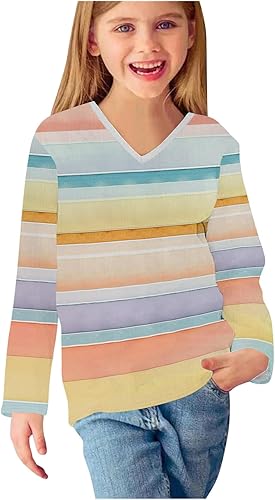 Girls Rainbow Striped Tunic Tops V Neck Casual Long Sleeve T-Shirt Loose Soft Swing Kids Pullover Blouse Tees for 3-14 Years(01 Multicolor,5T)
