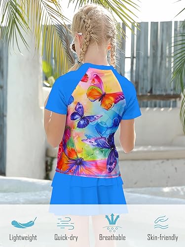 DESIGN & PATTERNS:2-piece girls swimsuit set consists of short sleeve shirt and ruffled skirt with bottom shorts; The pattern design of rashguard is novelty and stylish, butterflies, Hawaiian coconut trees, marble, fluids, floral, and animals provide your girl with more choices