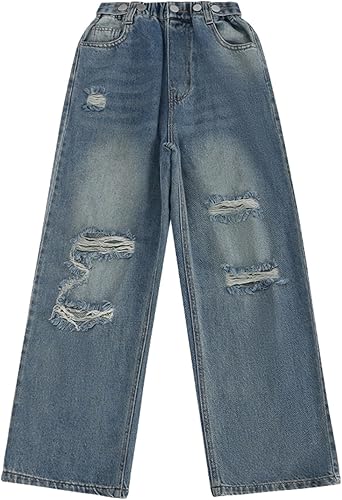 Girls Ripped Jeans Elastic High Waist Straight Denim Pants Teen Kids School Retro Casual Streetwear Jeans Trousers(Blue,15-16 Years)