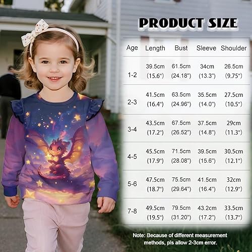 Suggestion: This round-neck long-sleeved sweatshirt is machine washable and hand washable, suitable for girls aged 1-8. Please refer to our size chart.If your child is stronger than average height or physique, please consider choosing one or two sizes larger