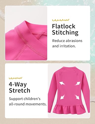 Cute Ruffled Design: The ruffled long sleeves can pair with bikini bottoms, bikini tops, shorts, and skirts. Matching swimwear and boardshorts are also available, making it easy to put together a perfect swimming outfit for your little one