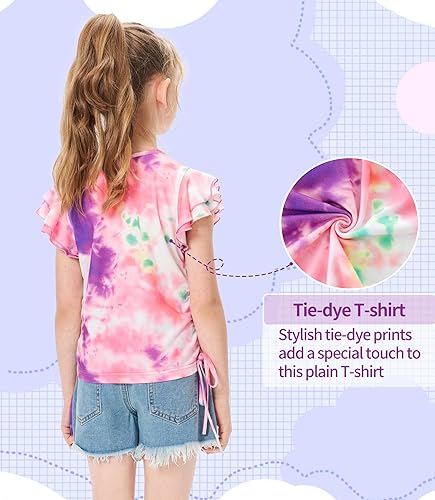 Vibrant Tie-Dye Design: Stand out with this top’s eye-catching, multicolored tie-dye pattern! The flutter sleeves and roundneckline add a touch of cuteness, while the side drawstrings allow for adjustable fit, ensuring a trendy and personalized look for your little fashionista
