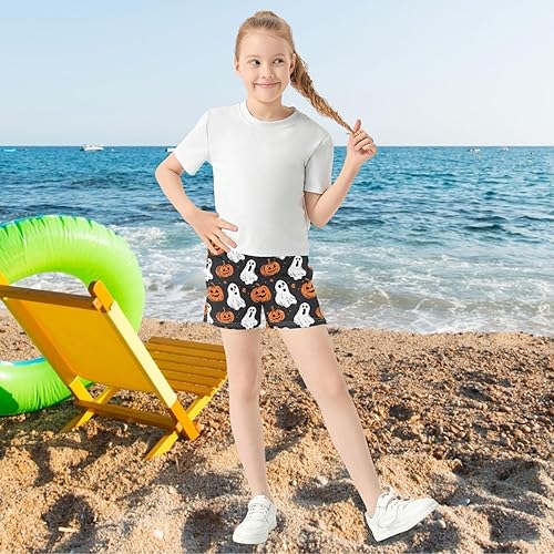 Girls Shorts Summer Halloween Pumpkin White Ghost Athletic Shorts with Stretchy Elastic Waist Beach Shorts XS-XL(Multi,X-Large)