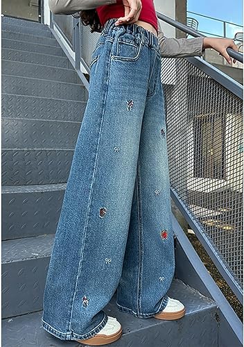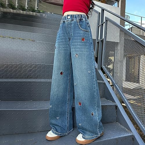 Girls Sparkly Denim Pants Cute Graphic Elastic Waist Straight Leg Jeans for Kids 5 to 16 Years(Blue,15-16 Years)