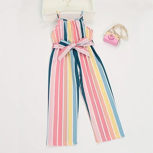 Girls Striped Jumpsuits Wide Leg Long Pants Sleeveless Rompers Spaghetti Strap Jumpsuits for Kids Girls Loose Overalls(Red,5-6 Years)