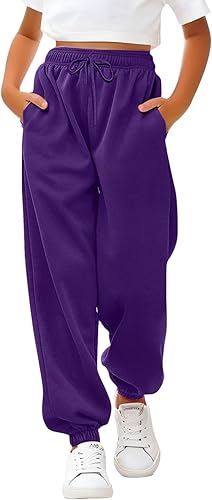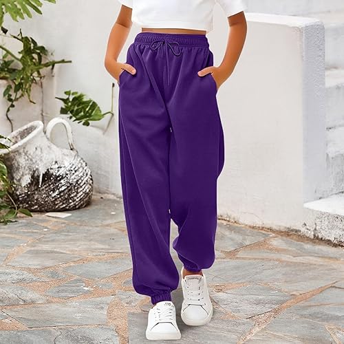 Girls Stylish Baggy Sweatpants Elastic High Waist Solid Color Sport Pants Youth Teen Comfy Streetwear Casual Trouser(Dark Purple,13-14 Years)