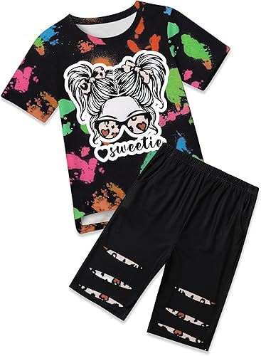 Design: The tie-dye girls clothes on the short-sleeve top adds a trendy touch, while the sweetie-girl print enhances the overall design.The casual shorts leggings complete the ensemble with their relaxed style.Super cute girls outfits
