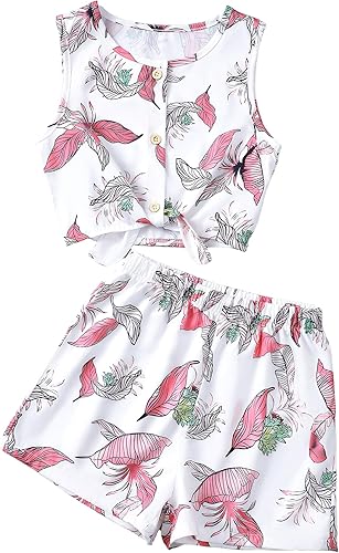 Feature:This girls summer clothes is a hawiian style clothing set,feature a button-down sleeveless crop top decorating with bunding hem,matching with elastic waistband shorts,the tropical style printed is the best beach outfits for girls in spring summer.