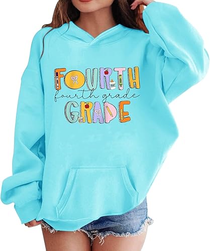 Girls Sweatshirt Fourth Grade Back to School Pullover Hoodies Kids Oversized Hooded Outfit 1st Day of School Clothes(Sky Blue,11-13 Years)